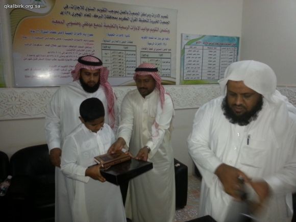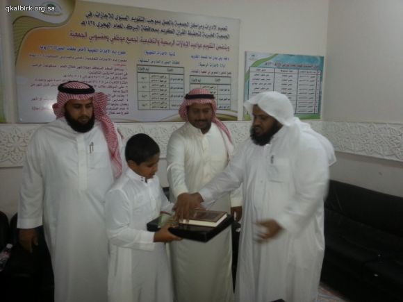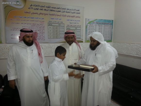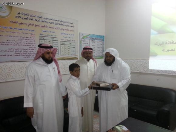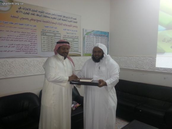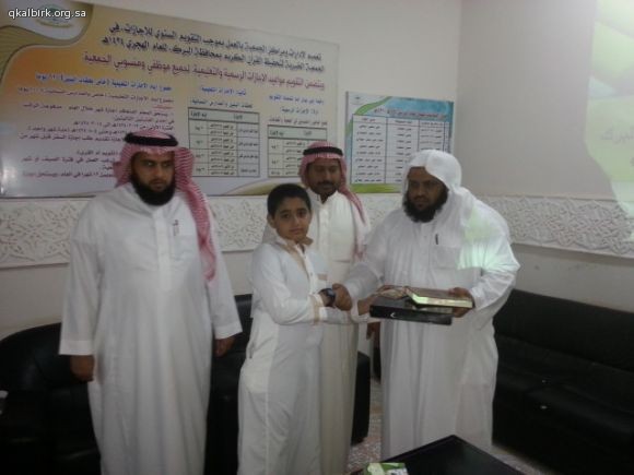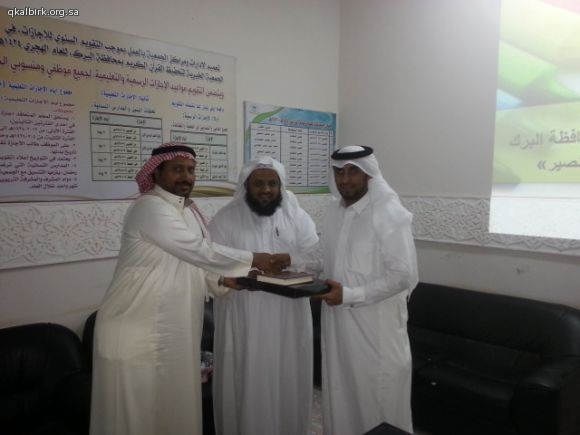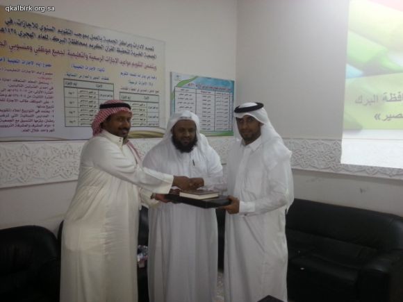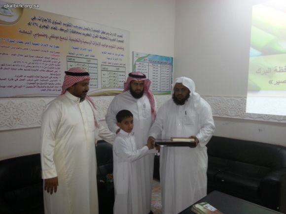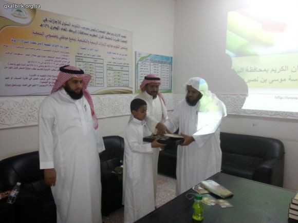 ضمن برامج الزيارات الميدانية للتوعية الإسلامية بمدرسة موسى بن نصير الإبتدائية بمحافظة البرك تشرّفت الجمعية الخيرية لتحفيظ القرآن الكريم بزيارة معلمي وطلاب المدرسة صباح يوم الخميس 2-2-1435 هـ ولقد أطلعوا خلال الزيارة على عرض تعريفي و طبيعة عمل الجمعية واحصائيات بعدد الحلقات والدور النسائية وبرامجها ونطاقها الجغرافي الذي تصل إليه بعد ذلك تم إطلاعهم على موقع الجمعية الإلكتروني وعلى مكتبة القرآن الكريم المرئية والصوتية وعلى أوقاف الجمعية ومراحلها . وفي الختام تم توزيع الهدايا عليهم سائلين الله لهم التوفيق والسداد وشاكرين لهم ثقتهم وتشريفهم لأخوانهم في التحفيظ