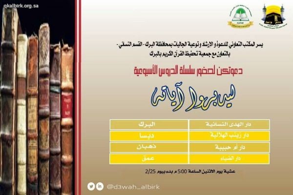يسر القسم النسائي بالمكتب التعاوني للدعوة والإرشاد وتوعية الجاليات بمحافظة البرك بالتعاون مع الجمعية الخيرية لتحفيظ القرآن الكريم بمحافظة البرك دعوتكن لحضور سلسلة الدروس الأسبوعية " ليدبروا آياته " وذلك بكل من الدور النسائية التالية : دار الهدى النسائية - البرك , زينب الهلالية - دبساء , أم حبيبة - ذهبان , الضياء - عمق وذلك عشية يوم الأثين الساعة الخامسة مساء .