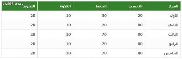 8- يحسم على كل خطأ في التجويد نصف درجة , وفي حال تكرار الخطأ ذاته يكرر الحسم بعدد مرات الخطأ بنفس النسبة.