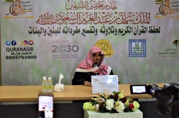 تشرفت الجمعية الخيرية لتحفيظ القرآن الكريم بمحافظة البرك بمشاركة أبنائها الطلاب في التصفيات النهائية المؤهلة لجائزة خادم الحرمين الشريفين في دورتها الـ (22) لحفظ القرآن الكريم وتلاوته وتفسير مفرداته على مستوى منطقة عسير للبنين للعام 1441هـ والتي عُقدت في مدينة أبها في الفترة من 15-19 /1441/6هـ ولقد شارك كل من الطالب عاصم احمد البجادي في الفرع الثاني والطالب ماجد حمد الصبيحي في الفرع الثالث والطالب أحمد محمد الصبيحي في الفرع الرابع والطالب عمر علي الحسن الصبيحي في الفرع الخامس ولقد قامت الجمعية الخيرية لتحفيظ القرآن الكريم في منطقة عسير بتكريم الطلاب المشاركين