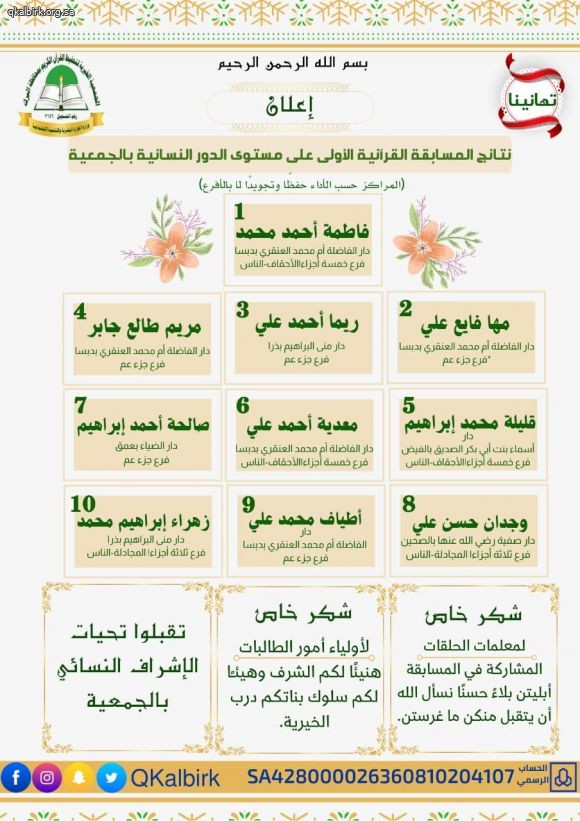 نتائج المسابقة القرآنية الأولى على مستوى الدور النسائية بالجمعية