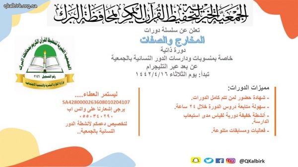 الجمعية الخيرية لتحفيظ القرآن الكريم بمحافظة البرك تعلن عن سلسلة دورات المخارج والصفات دورة ذاتية
