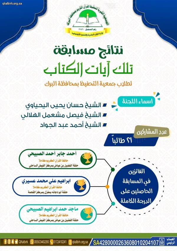 نتائج مسابقة تلك آيات الكتاب لطلاب الجمعية الخيرية لتحفيظ القرآن الكريم بالبرك