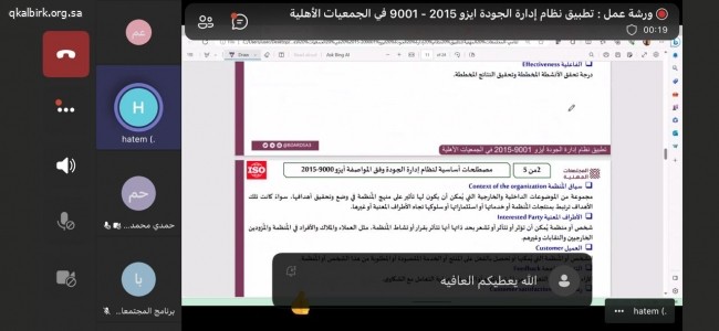 المشاركة في ورشة عمل (تطبيق نظام إدارة الجودة ايزو 2015 - 9001 في الجمعيات الأهلية)