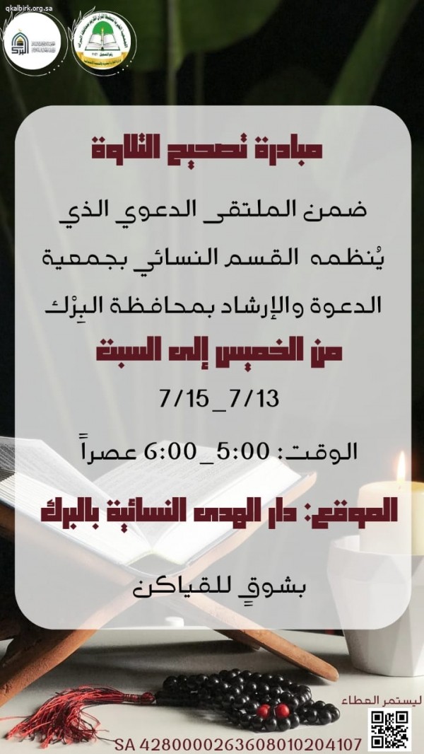 يتشرف القسم النسائي بتقديم مبادرة تصحيح التلاوة وذلك ضمن الملتقى الدعوي الذي يُنظمه القسم النسائي بجمعية الدعوة والإرشاد وتوعية الجاليات بمحافظة البرك وذلك في الفترة من الخميس 13-07 إلى السبت 15-7-1445 هـ وذلك في مقر دار الهدى النسائية بالبرك