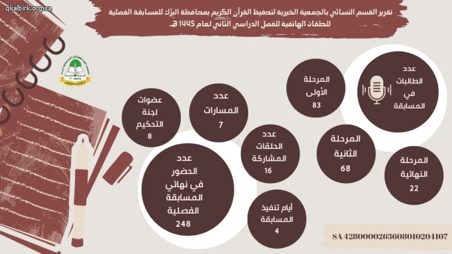 تقرير القسم النسائي بالجمعية الخيرية لتحفيظ القرآن الكريم بالبرك للمسابقة الفصلية للحلقات الهاتفية للفصل الدراسي الثاني لعام 1445هـ