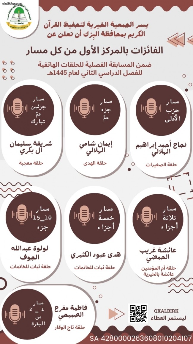 يسر الجمعية الخيرية لتحفيظ القرآن الكريم بالبرك أن تعلن عن الفائزات بالمركز الأول بكل مسار ضمن المسابقة الفصلية للحلقات الهاتفية للفصل الدراسي الثاني لعام 1445هـ