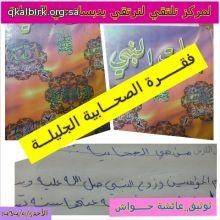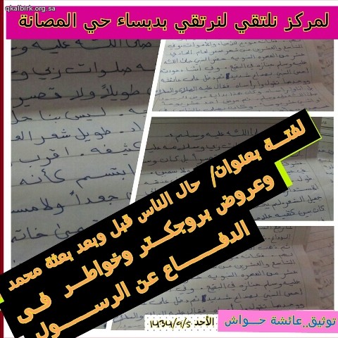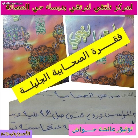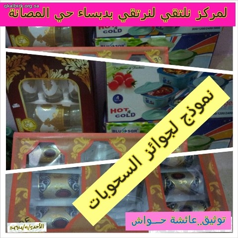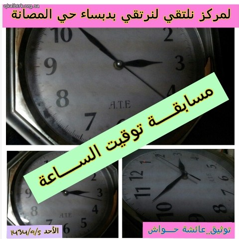 زانة الهلالي التقرير اليومي عن فعاليات مركز نلتقي لنرتقي اليوم / الأحد 5 / 9 / 1434 هــ كان بفضل الله عدد الحضور ( 240 ) بدأت فعاليات الملتقى بلفتة عن الرسول صلى الله عليه وسلم من ولادته حتى وفاته مع عروض بروجكتر تتخلل اللفته ومن ثم فقرة أبدعي بنيتي " مشاركات و أناشيد مقدمه من البراعم " وايضاً اكتشفي الصحابية " طرح نبذه عن صحابية جليلة و الجمهور يكتشف من هي الصحابية " وبعد ذلك بدأت المسابقات بكل من : مسابقة الطلبات " أسرع متسابقة تحضر المطلوب تحسب لها نقطة " و أفضل بيت شعر ( بدع ) من الأمهات و مسابقة أسرع متسابقة تمص الرضاعة و تشرب العصير ومسابقة تلحين الاسم ومسابقة أسرع متسابقة توقت الساعةوايضاً مسابقة لعبة الجمرة ومسابقة أفضل صوت و نشيد