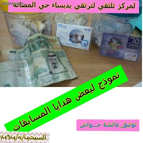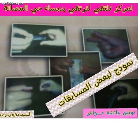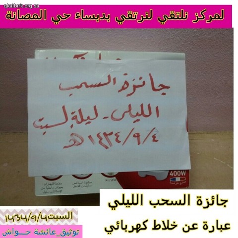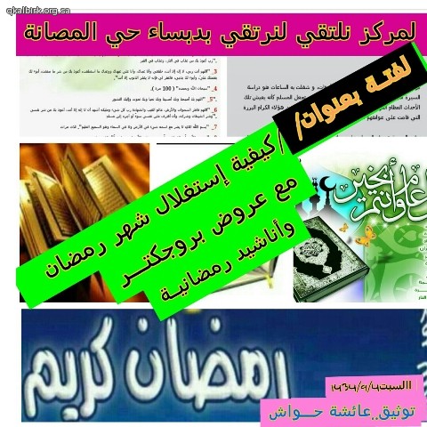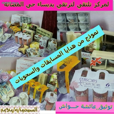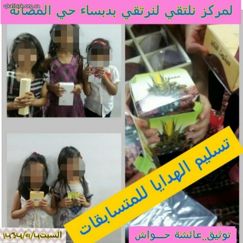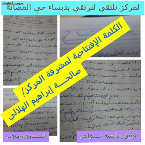 عبد الله هادي تم بفضل الله افتتاح فعاليات مركز نلتقي لنرتقي بدبساء بحي المصانة والذي يقام بالتعاون بين الجمعية الخيرية لتحفيظ القرآن الكريم بمحافظة البرك ولجنة التنمية الاجتماعية الأهلية بالبرك اليوم السبت 4 /9 /1434 هــ حيث كانت الكلمة الإفتتاحية لمشرفة المركز / صالحة إبراهيم الهلالي ومن ثم بلفتة بعنوان كيفية استغلال شهر رمضان مع عروض بروجوكتور وأناشيد رمضانية وتلا ذلك العديد من المسابقات منها فقرة لمن الحبحب ومسابقة ترتيب الحروف وأختتم بعد ذلك بالسحب على الجائزة اليومية .