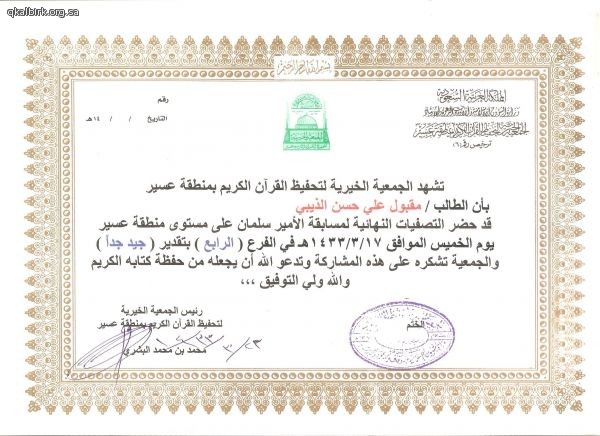 عبد الله هادي الجمعية الخيرية لتحفيظ القرآن الكريم بعسير تكرم الطالب : مقبول علي حسن الذيبي والذي حضر وشارك في التصفيات النهائية لمسابقة الأمير سلمان على مستوى منطقة عسير يوم الخميس الموافق 17-3-1433هـ في الفرع الرابع بتقدير جيد جيداً ولقد شكرته على المشاركة وتسأل الله ان يجعله من حفظة كتابه الكريم والله ولي التوفيق