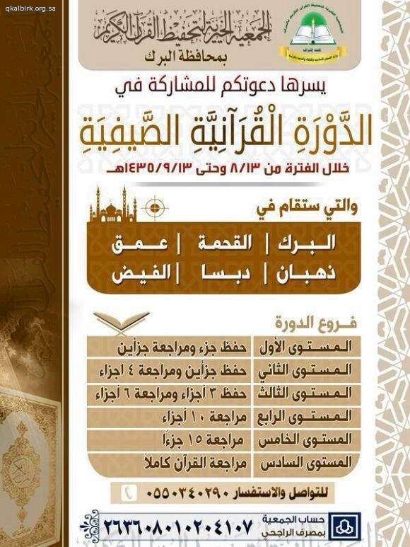 الجمعية الخيرية لتحفيظ القرآن الكريم بمحافظة البرك يسرها دعوتكم للمشاركة في الدورة القرآنية الصيفية للحلقات القرآنية والدور النسائية خلال الفترة من 13 / 8 وحتى 13 / 9 / 1435 هـ والتي ستقام في كل من البرك - القحمة - عمق - ذهبان - دبسا - الفيض وستكون الدورة في الفروع التالية :