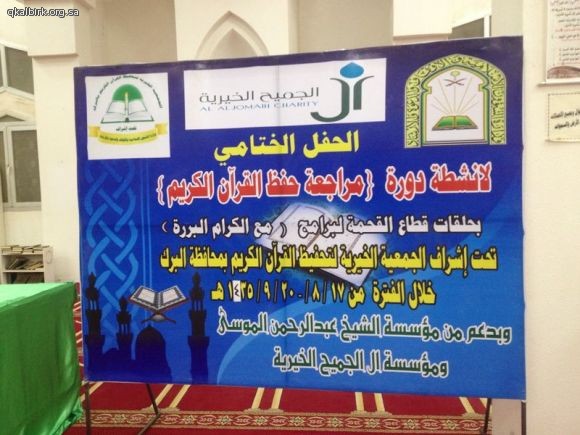 أقيم مساء اليوم اليوم الخميس الموافق 20 / 9 /1435هـ وبعد صلاة التراويح في الجامع الكبير بالقحمة الحفل الختامي لأنشطة (دورة مراجعة حفظ القرآن الكريم ) بقطاع القحمة وبدعم من مؤسسة الشيخ عبدالرحمن الموسى ومؤسسة آل الجميح الخيرية وبحضور رئيس الجمعية فضيلة الشيخ حسان بن يحيى اليحياوي وأعضاء مجلس إدارة الجمعية والمدير التنفيذي ومشرفي القطاعات . سائلين الله ان يبارك في ابنائهم ويثبت حفظهم ..