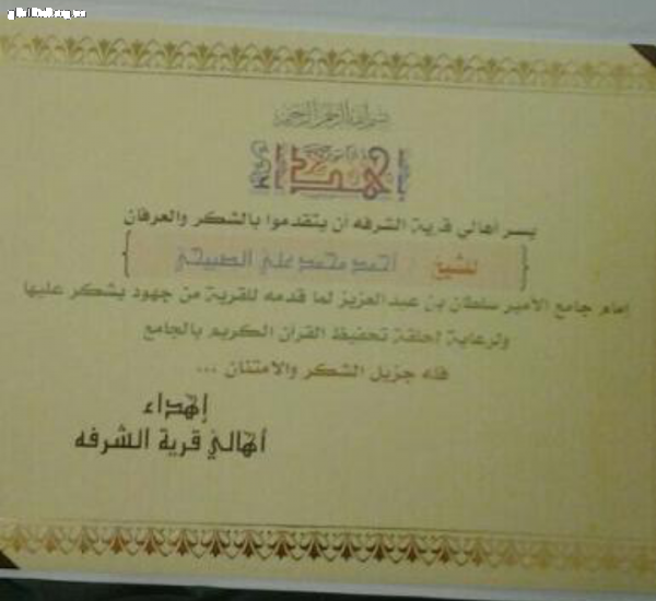 عبد الله هادي في بادرة رائعة ومميزة قام أهالي قرية الشرفة بتكريم الأستاذ أحمد محمد علي الصبيحي إمام جامع الأمير سلطان بن عبدالعزيز " رحمه الله " و معلم حلقة قرية شرفة المهاهـ فجزاهم الله كل خير ونفع بهم . ويتقدم فضيلة رئيس الجمعية الشيخ حسان بن يحيى اليحياوي بالشكر الجزيل لأهالي قرية الشرفة وللأستاذ أحمد الصبيحي على دورهـ المثمر والإيجابي بالقرية والحلقة.