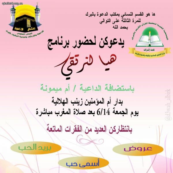 رهام عبد الله يتشرف القسم النسائي بمكتب الدعوة وتوعية الجاليات بمحافظة البرك وبالتعاون مع الجمعية الخيرية لتحفيظ القرآن الكريم بدعوتكن لحضور برنامج هيا لنرتقي وبإستضافة الداعية أم ميمونة بدار أم المؤمنين زينب الهلالية وذلك يوم الجمعة الموافق 14 / 6 / 1436هـ من بعد صلاة المغرب مباشرةوبإنتظاركن العديد من الفقرات الماتعة. عروض . بريد الحب . أسمى حب.