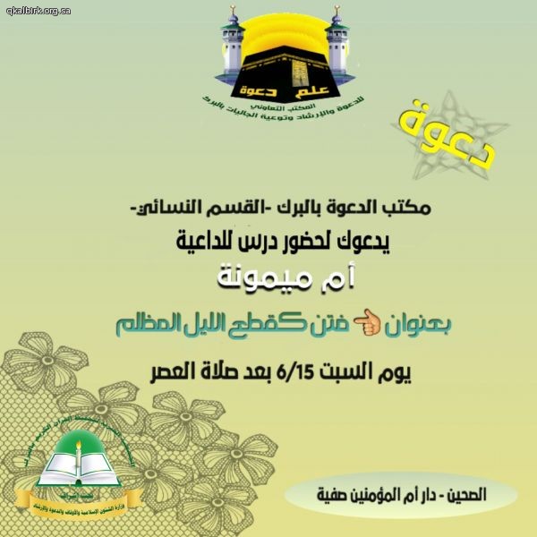 رهام عبد الله يتشرف القسم النسائي بمكتب الدعوة وتوعية الجاليات بمحافظة البرك وبالتعاون مع الجمعية الخيرية لتحفيظ القرآن الكريم بدعوتكن لحضور درس " فتن كقطع الليل المظلم " وبإستضافة الداعية أم ميمونة بدار أم المؤمنين صفية وذلك يوم السبت الموافق 15 / 6 / 1436هـ من بعد صلاة العصر مباشرة.