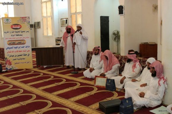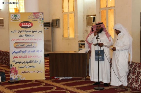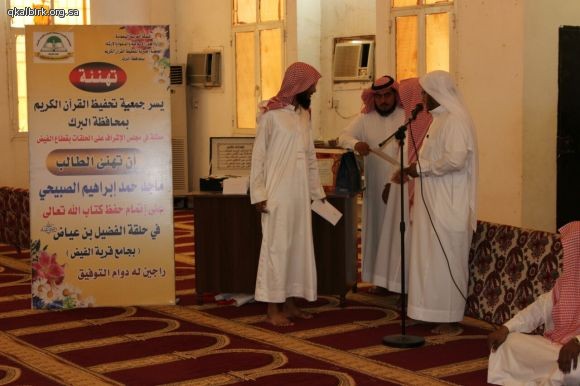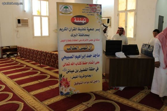 علي مسود - الفيض هنيئاً ثمّ هنيئاً لحافظ القرآن هنيئاً له هذا الشرف العظيم هنيئاً له تاج الوقار و هنيئاً لوالديه به يسر الجمعية الخيرية لتحفيظ القرآن الكريم بمحافظة البرك ممثله في مجلس الإشراف على الحلقات بقطاع الفيض أن تهنئ الطالب / ماجد حمد إبراهيم الصبيحي على إتمام حفظ كتاب الله تعالى في حلقة الفضيل بن عياض رضي الله عنه بجامع قرية الفيض