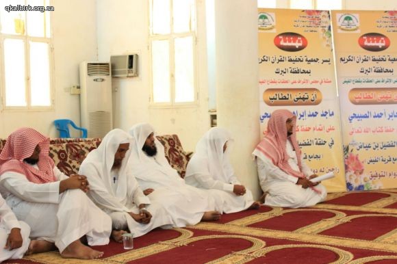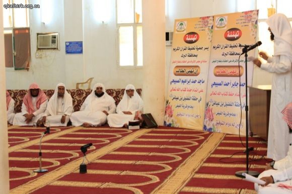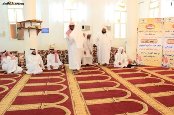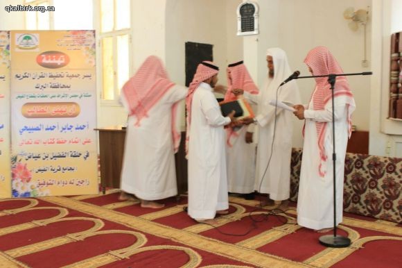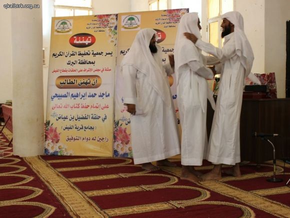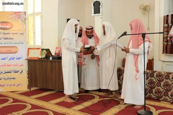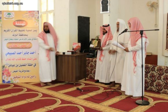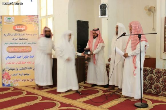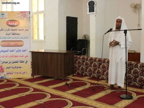 علي مسود الصبيحي ياحامل القران قد خصك الرحمن بالفضل والتيجان والروح والريحان هنيئاً ثمّ هنيئاً لحافظ القرآن هنيئاً له هذا الشرف العظيم هنيئاً له تاج الوقار و هنيئاً لوالديه به . تشرفت الجمعية الخيرية لتحفيظ القرآن الكريم بمحافظة البرك ممثله في مجلس الإشراف على الحلقات بقطاع الفيض بتكريم الطالب / أحمد جابر أحمد الصبيحي لإتمامه حفظ كتاب الله تعالى في حلقة الفضيل بن عياض رضي الله عنه بجامع قرية الفيض جرى ذلك بحضور رئيس الجمعية فضيلة الشيخ حسان بن يحيى اليحياوي وبعض أعضاء مجلس إدارة الجمعية والمدير التنفيذي واعضاء مجلس قطاع الفيض واهالي واعيان قرية الفيض لتكريم ابنهم , بارك الله في حفظه ونفع به الإسلام والمسلمين .