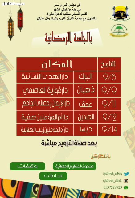 @d3wah_albirk في مجلس أنس وسمر في ليلة من ليالي الشهر المبارك يتشرف القسم النسائي بمكتب الدعوة بالبرك وبالتعاون مع الجمعية الخيرية لتحفيظ القرآن الكريم بمحافظة البرك بدعوتكن " الجلسة الرمضانية "