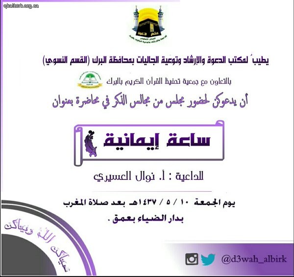 يسر القسم النسائي بالمكتب التعاوني للدعوة والإرشاد وتوعية الجاليات بمحافظة البرك بالتعاون مع الجمعية الخيرية لتحفيظ القرآن الكريم بمحافظة البرك دعوتكن لحضور مجلس من مجالس الذكر "ساعة إيمانية " للداعية : أ.نوال العسيري وذلك يوم الجمعة 10-5-1437هـ بعد صلاة المغرب بمشئية الله بدار الضياء بعمق .