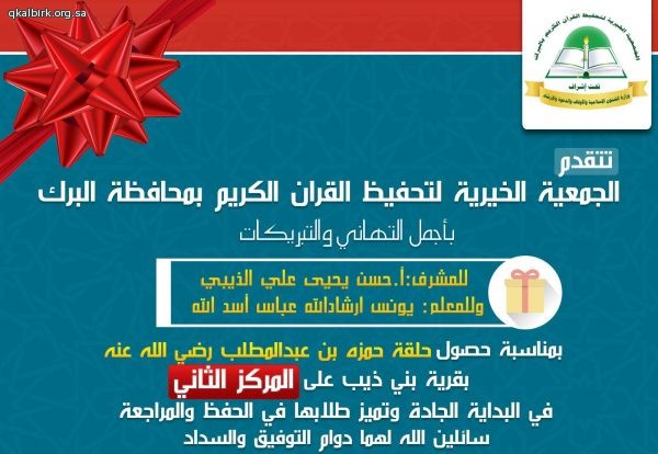 عبد الله هادي تتقدم الجمعية الخيرية لتحفيظ القرآن الكريم بمحافظة البرك بأجمل التهاني والتبريكات للمشرف :أ.حسن يحيى علي الذيبي ولمعلم الحلقة الاستاذ: يونس أرشد الله عباس أسد الله بمناسبة حصول حلقة حمزة بن عبدالمطلب رضي الله عنه بقرية بني ذيب على المركز الثاني في البداية الجادة وتميز طلابها في الحفظ والمراجعة سائلين الله لهما دوام التوفيق والسداد