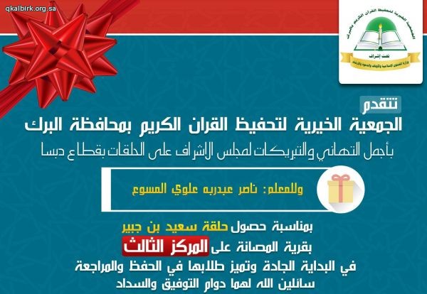 عبد الله هادي تتقدم الجمعية الخيرية لتحفيظ القرآن الكريم بمحافظة البرك بأجمل التهاني والتبريكات لمجلس الإشراف على الحلقات بقطاع دبسا ولمعلم الحلقة الاستاذ:ناصر عبدربه علوي المسوع بمناسبة حصول حلقة سعيد بن جبير بقرية دبسا على المركز الثالث في البداية الجادة وتميز طلابها في الحفظ والمراجعة سائلين الله لهما دوام التوفيق والسداد