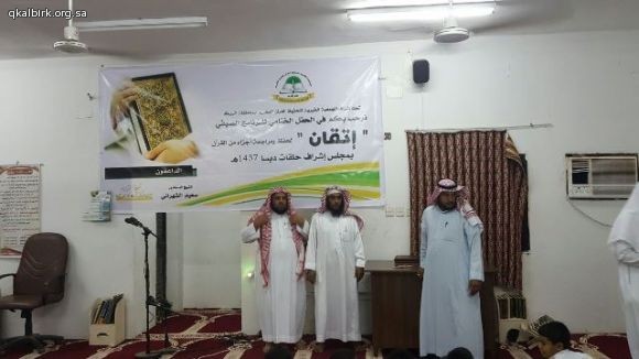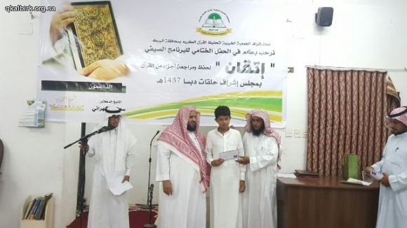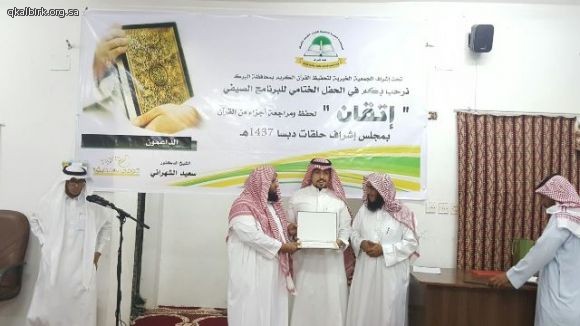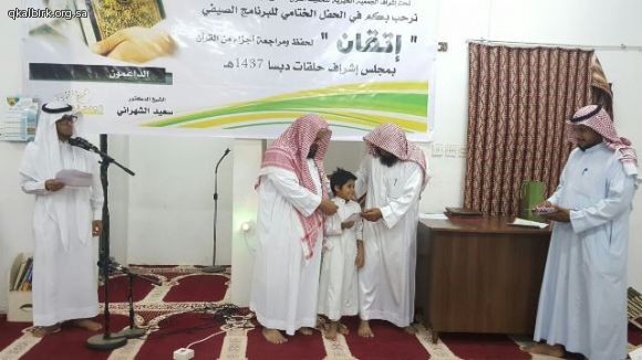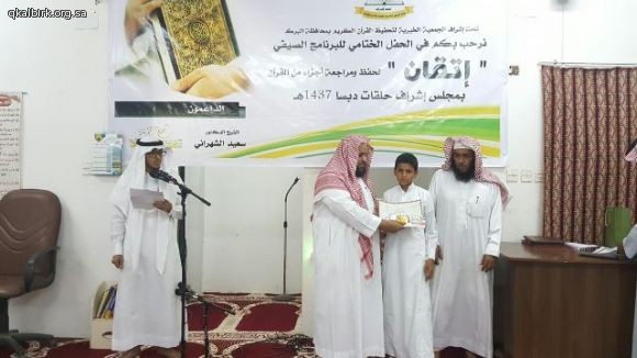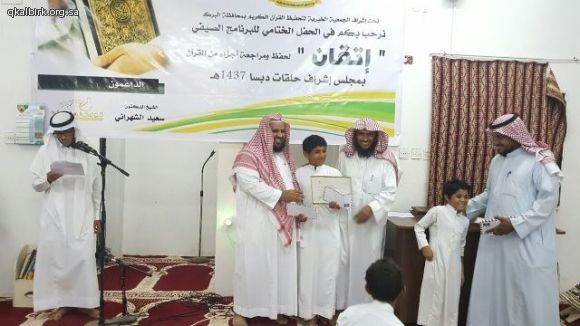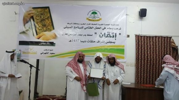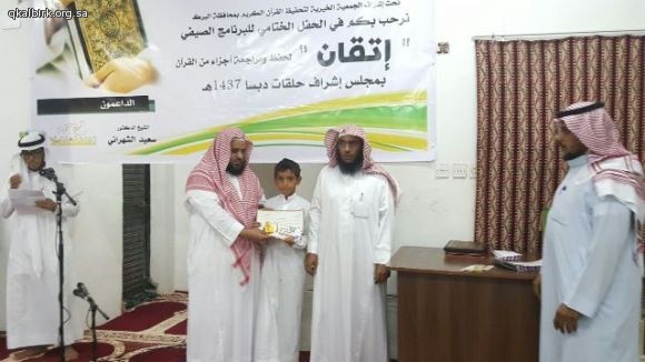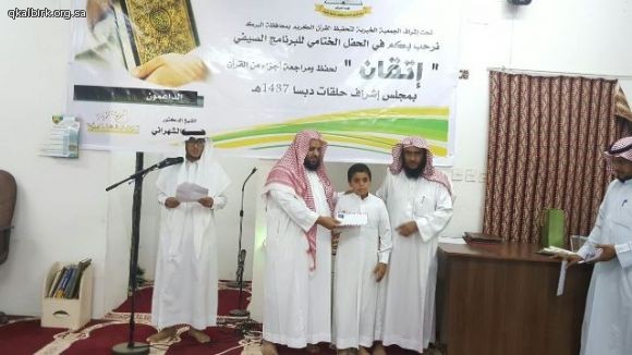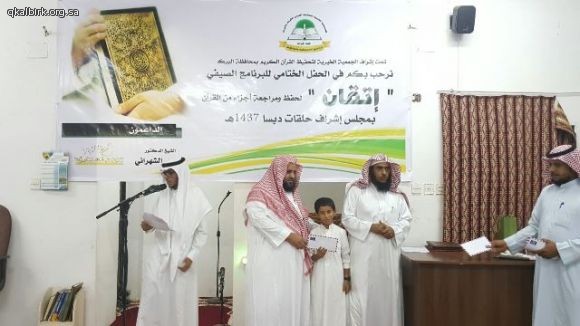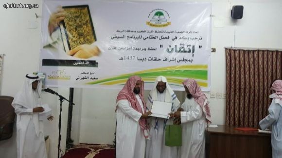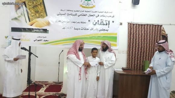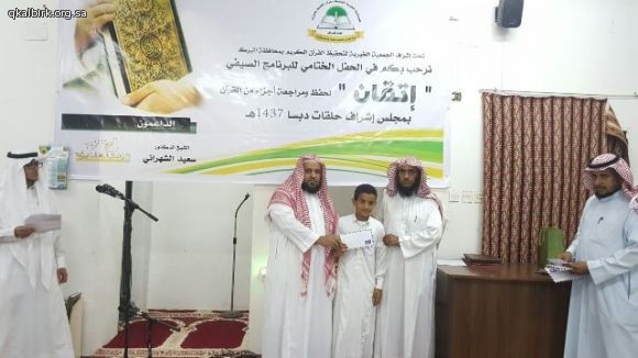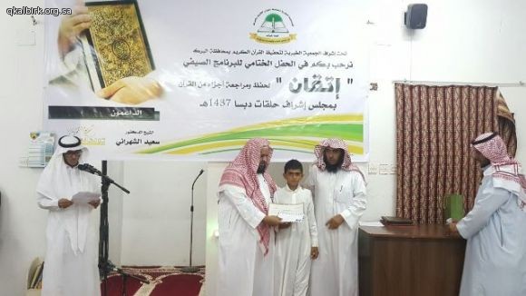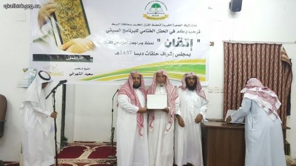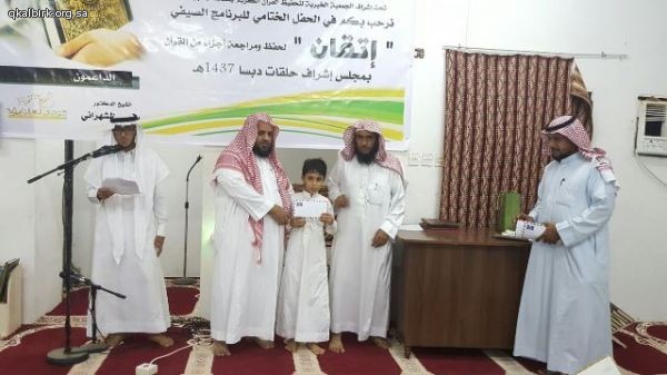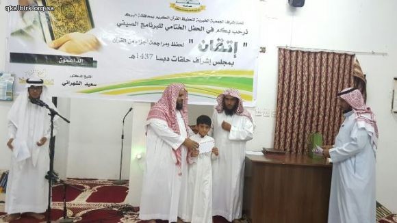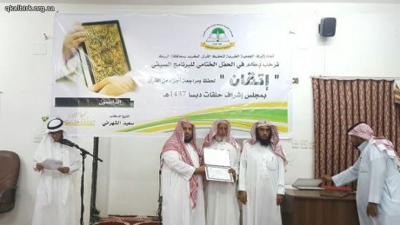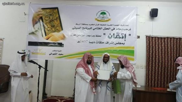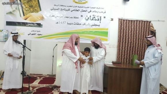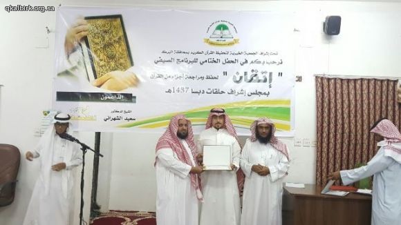 تحت اشراف الجمعية الخيرية لتحفيظ القرآن الكريم بمحافظة البرك اقام مجلس قطاع حلقات دبسا حفل تكريم طلاب برنامج (إتقان لحفظ ومراجعة اجزاء من القرآن)الصيفي الاول الجمعة الماضية 13 محرم وقد شرف الحفل مدير جمعية التحفيظ بالبرك الشيخ طالع الهلالي ورئيس مجلس قطاع الحلقات بدبسا الشيخ الحسين الهلالي وعضو مجلس الادارة الشيخ احمد الحسين ومشايخ اعيان القرية الشيخ فايع الهلالي والشيخ ابراهيم السبع وجمع من اولياء الامور وقد تم تكريم الطلاب المتميزين في البرنامج وهم 39 طالبا من بين 69 طالب مشارك في البرنامج ، وقد تقرر البرنامج الصيفي اتقان من 12 شوال الی22 من شهر ذو القعدة 1437 وقد تم تنفيذ البرنامج في ثلاث حلقات: