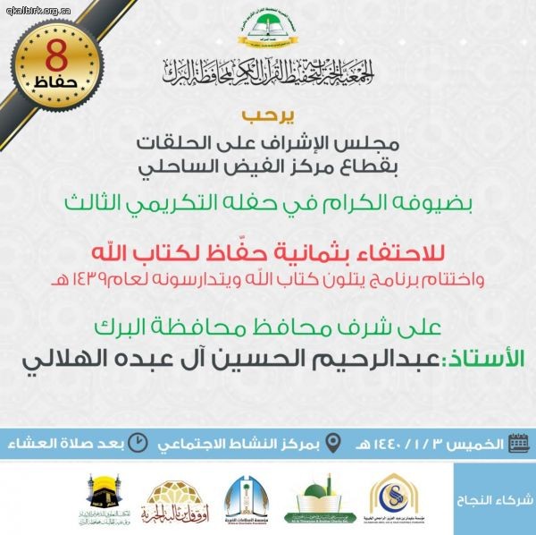 يسر مجلس الإشراف على الحلقات بقطاع مركز الفيض الساحلي أن يدعوكم لحضور حفله التكريمي الثالث للإحتفاء بثمانية حفّاظ لكتاب الله واختتام برنامج يتلون كتاب الله ويتدارسونه لعام 1439 هـ وذلك على شرف محافظ محافظة البرك الاستاذ / عبدالرحيم الحسين آل عبده الهلالي وذلك يوم الخميس 03-01-1440هـ بمركز النشاط الاجتماعي بالفيض الساحلي من بعد صلاة العشاء