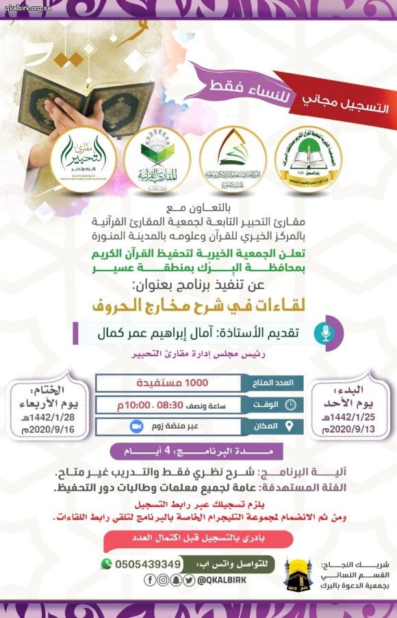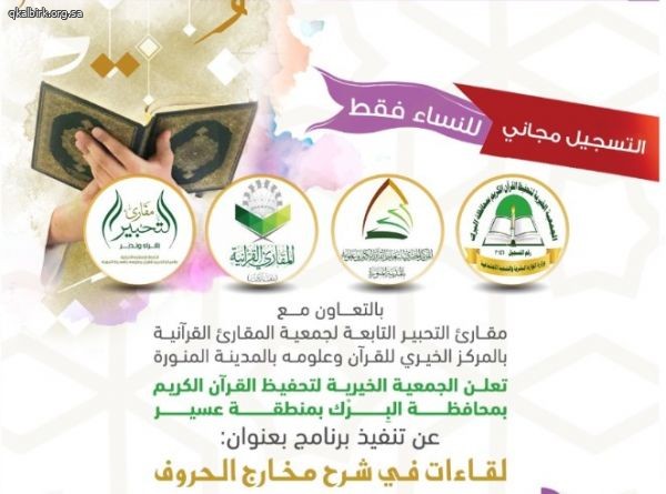 جمعية تحفيظ القرآن الكريم بمحافظة البرك بالتعاون مع مقارئ التحبير التابعة لجمعية المقارئ القرآنية بالمركز الخيري للقرآن وعلومه بالمدينة المنورة
