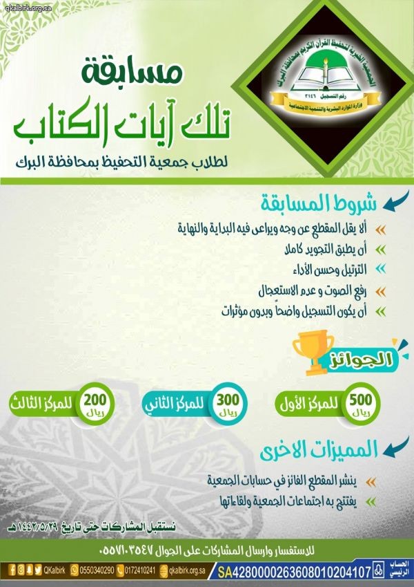 علي مسود تعلن الجمعية الخيرية لتحفيظ القرآن الكريم بمحافظة بالبرك عن أقامة مسابقة تلك آيات الكتاب لطلاب الجمعية الخيرية لتحفيظ القرآن الكريم بالبرك